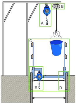 Tijdens de uitgravingsfase wordt een portiekconstructie over de opening gemonteerd, zoals aangegeven op het schema. De eerder vermelde lier wordt daaraan bevestigd om de kipbakken met aarde naar boven te halen (zie B). Er kan gemakkelijk een beveiligde stoeltjeslift (die meer bepaald uitgerust is met een veiligheidsketting en verbonden is aan een valstopapparaat) aan opgehangen worden om de arbeiders tot de bodem van de sleuf en weer omhoog te brengen.