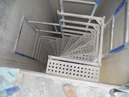 Na overleg met de bouwdirectie, de preventieadviseur van de hoofdaannemer en de verantwoordelijke onderaannemer werd beslist om een trappensteiger (van het type Easystep) te plaatsen. Voor een dergelijke trappensteiger is een liftkoker nodig van minstens 1,55 m bij 1,55 m. De maximale opbouwhoogte is drie verdiepingen. De schacht moet voorzien worden van degelijke verlichting. De trappensteiger moet dan weer voorzien worden van leuningen ter hoogte van de afstap en ter hoogte van de opening naast de afstap. Deze leuning levert echter geen hinder op voor de verdere werkzaamheden (plaatsen van dekvloeren en pleisterwerken).